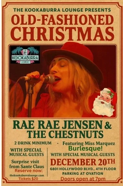 Come one, come all - my Christmas-in-LA people, my musicians, my misfits, and anyone who's in town and not on a gig... ** I want to see every single one of you there. I'm bringing an OLD-FASHIONED CHRISTMAS to the heart of Hollywood at the beautiful Kookaburra Lounge, and I'm truly honored to grace their stage this season. Rae Rae Jensen & The Chestnuts Performing songs off the Band of Liars Christmas album - soulful rock & soul classics produced by Shane Soloski Backed by the incredible Band of Liars themselves + Plus VERY special musical guests Featuring the fabulous Miss Marquez Burlesque! And yes... a surprise appearance from Santa Claus After the year we've all had — the work, the hustle, the heaviness - sometimes Christmas music is the thing that brings us back to that familiar place in our hearts. The magic, the nostalgia, the closeness, the dreams, the losses, the triumphs... all the things that remind us why we keep going in this wild city of dreams.